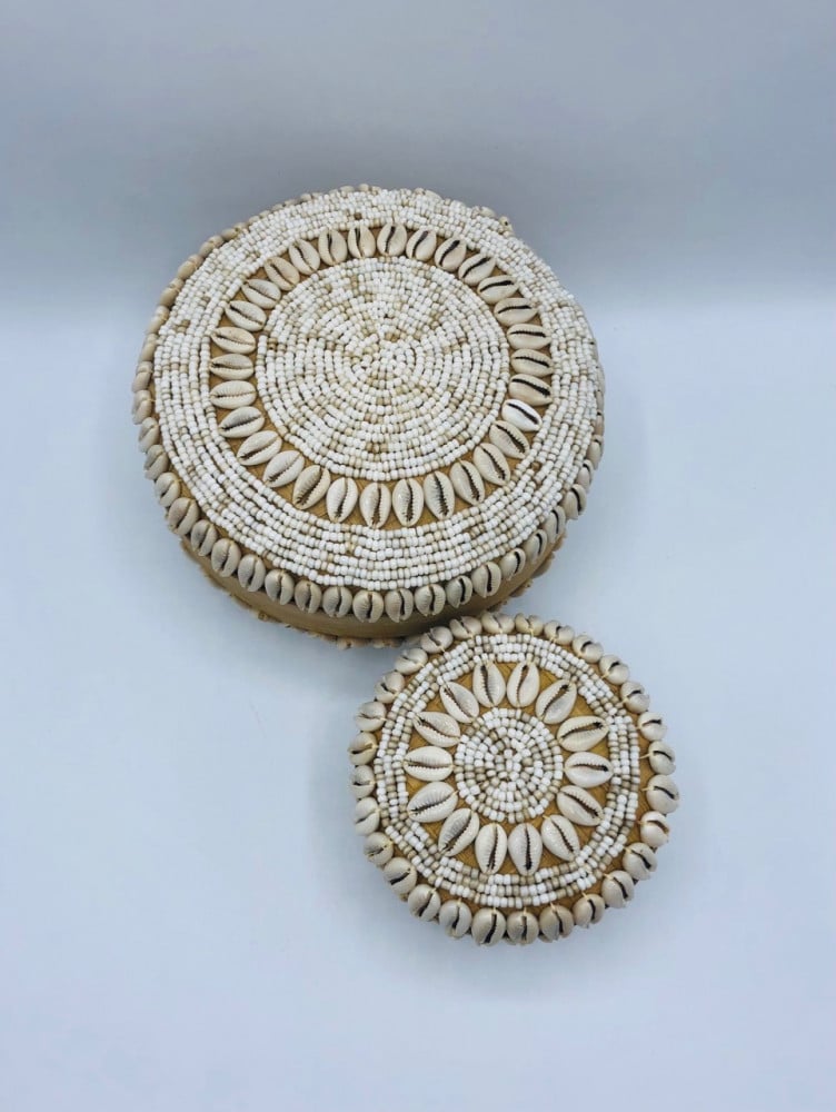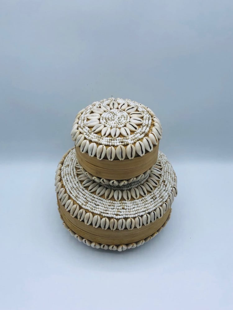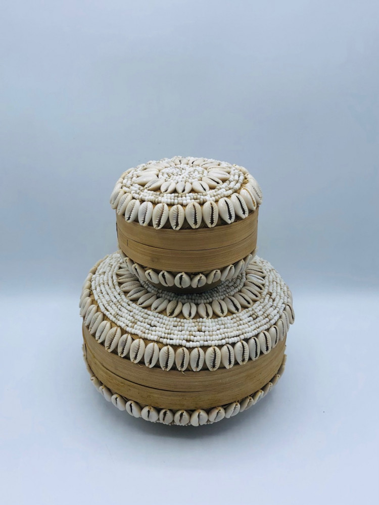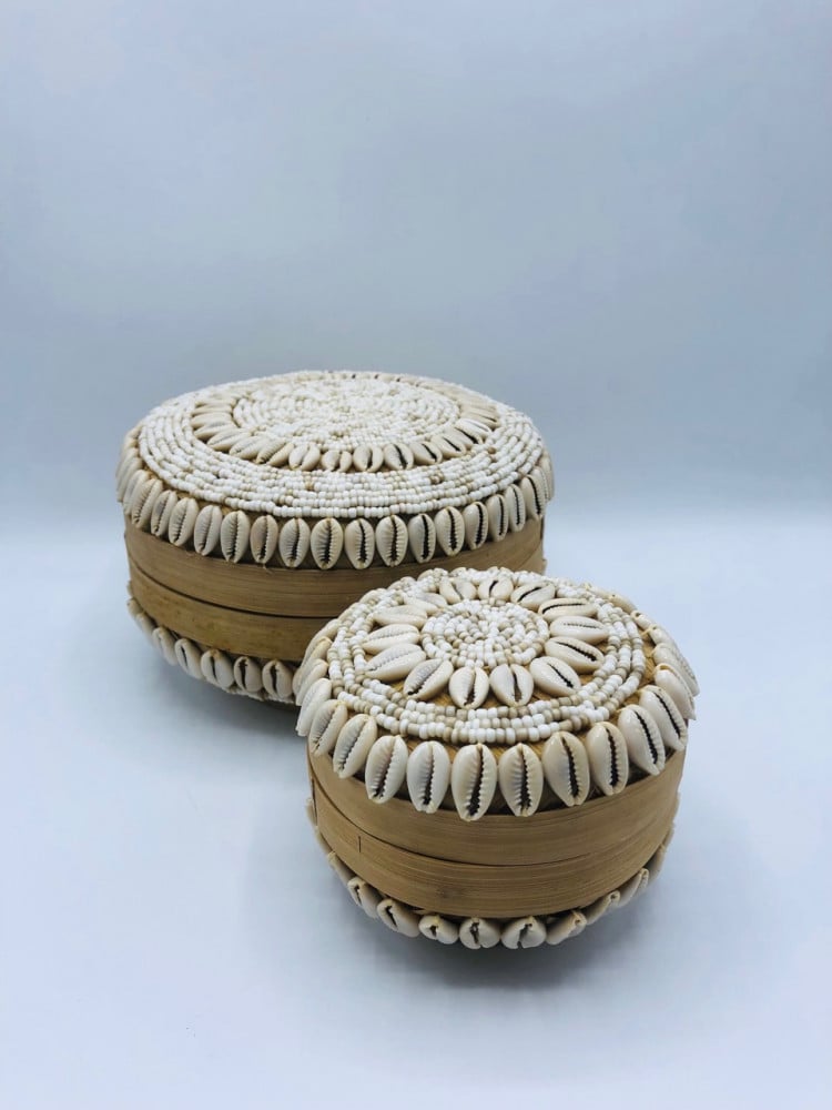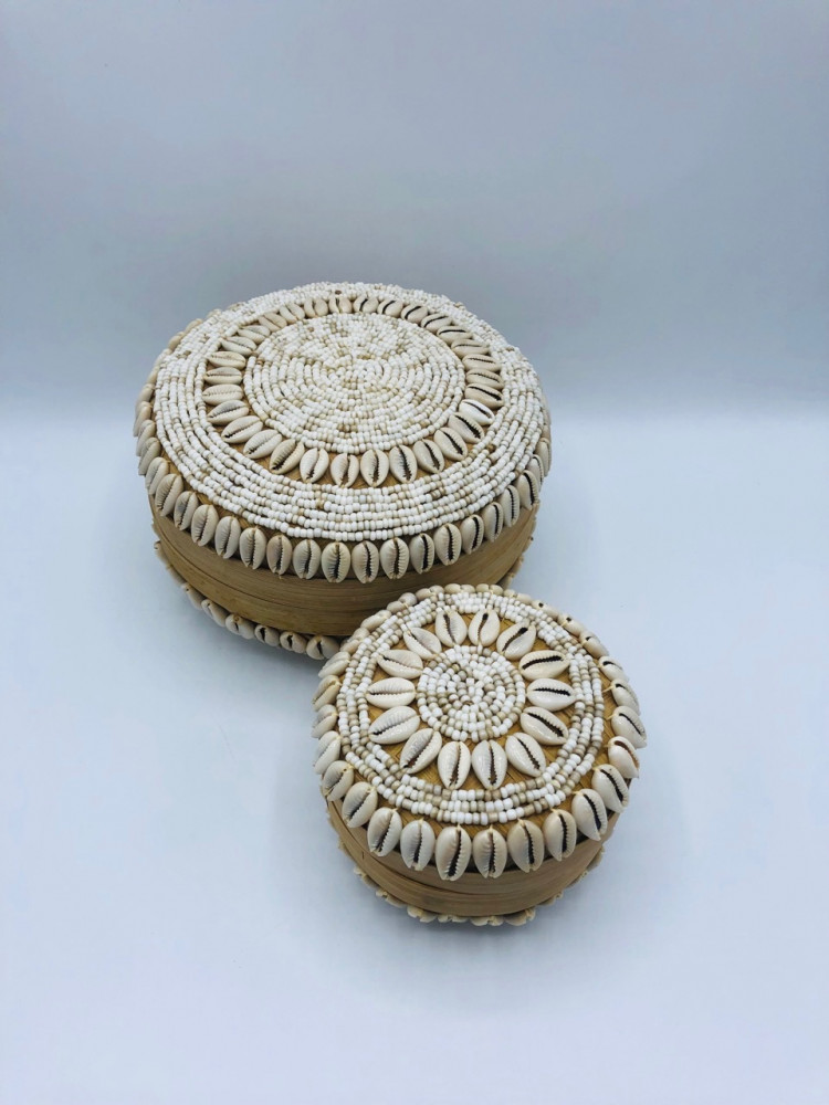 علب مدورة من الخوص مزينة بالقواقع (15سم، 10سم)