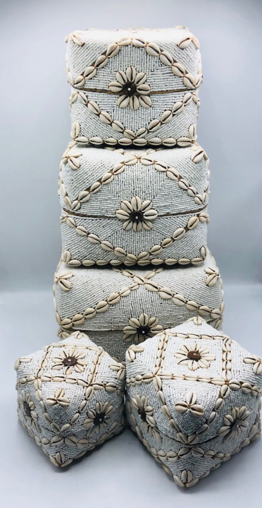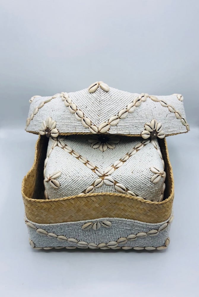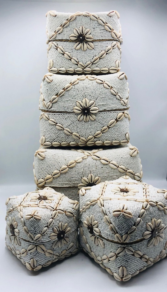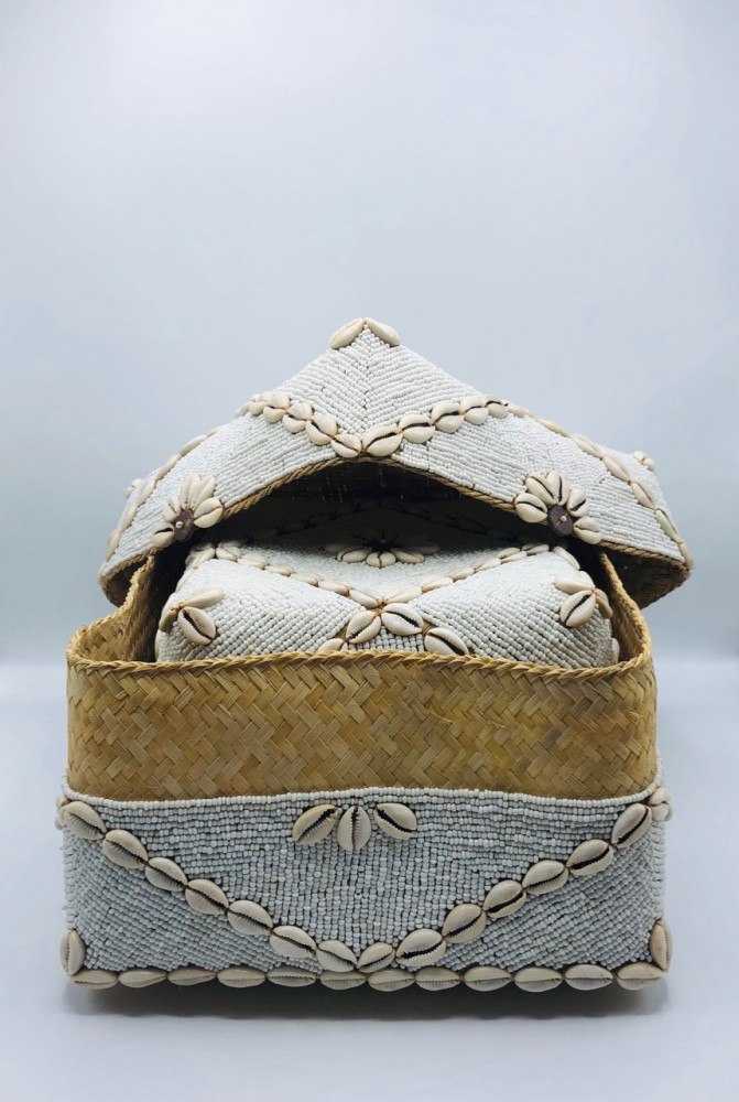 صناديق من الخوص الطبيعي مزينة بالخرز مكونه من 5 صناديق بداخل بعضها بغطاء لكل صندوق (25سم،20سم،16سم،13سم،10سم)