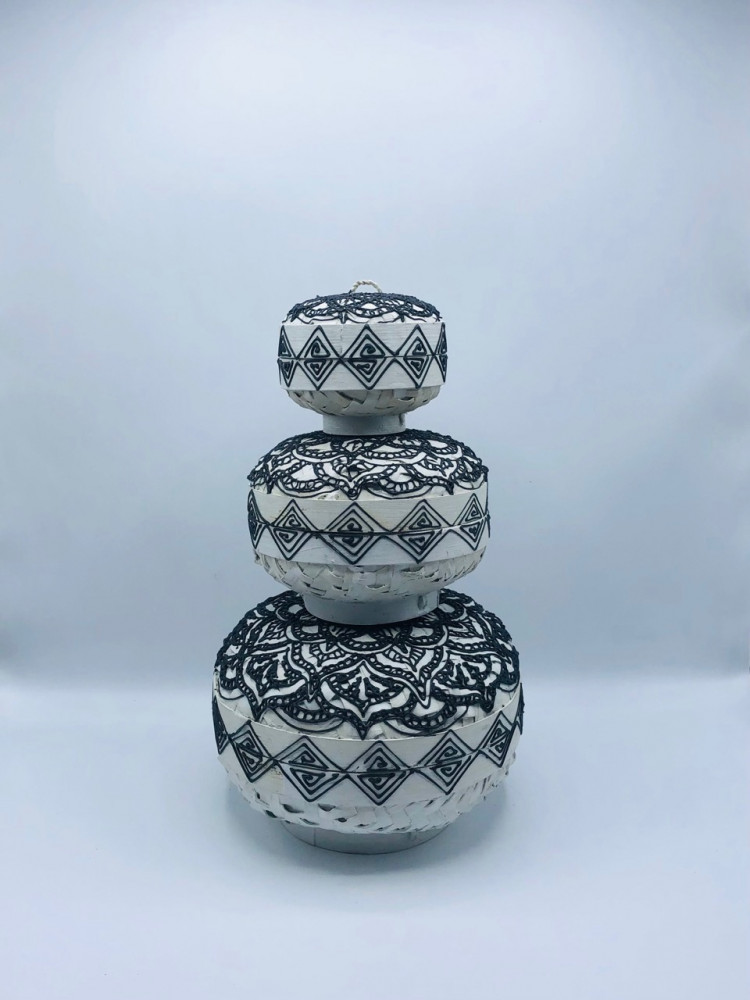 3 صناديق صغيرة الحجم ( 20سم ، 15سم ، 10سم ) بداخل بعضها مع غطاء لكل صندوق.