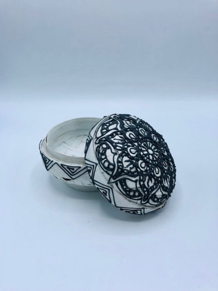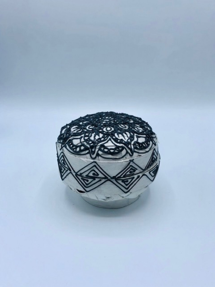 علبة صغيرة من الخوص لون أبيض مزينة باللون الأسود ( 5 سم )