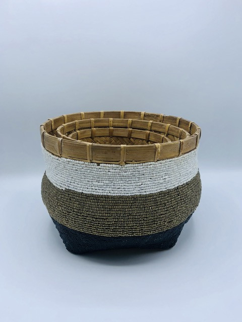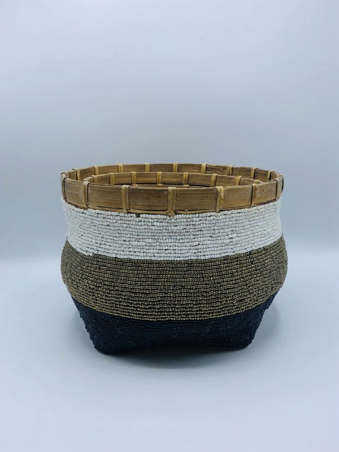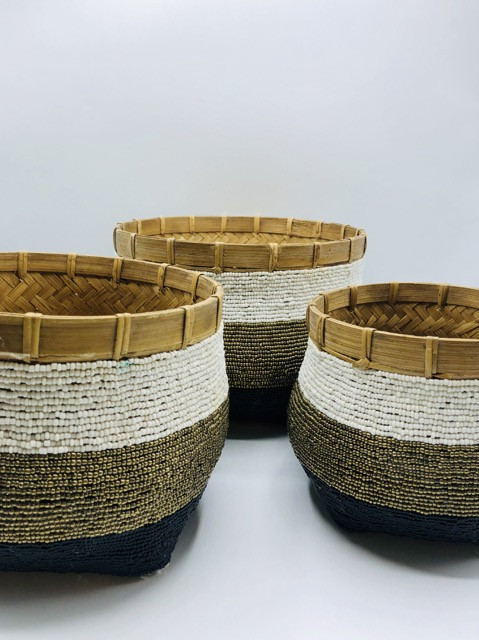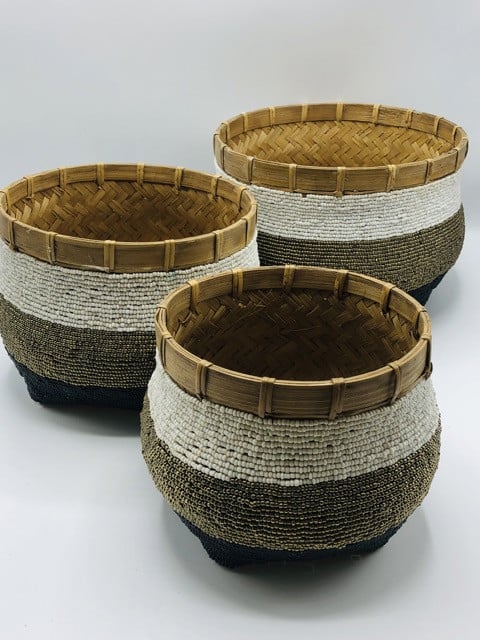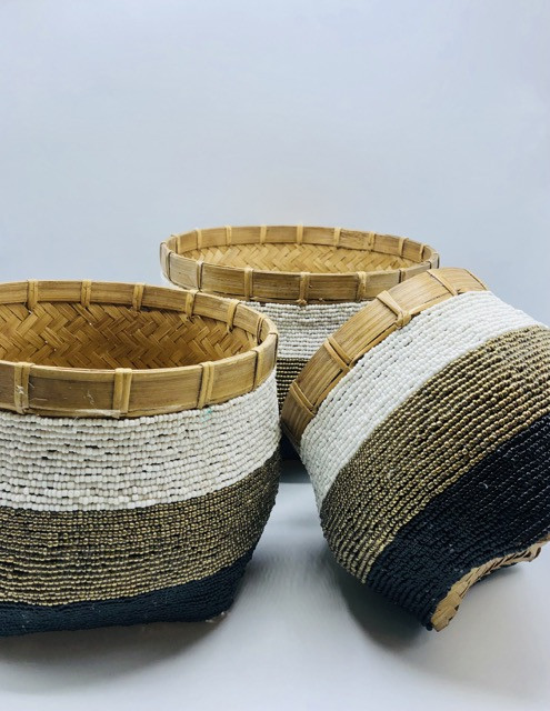 أحواض زراعية من الخوص مزينة بالخرز (لون ذهبي وأبيض وأسود)