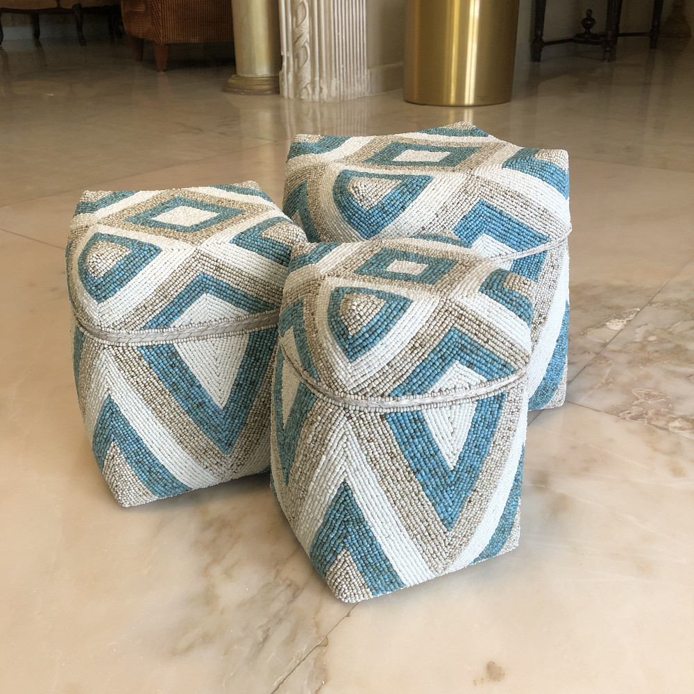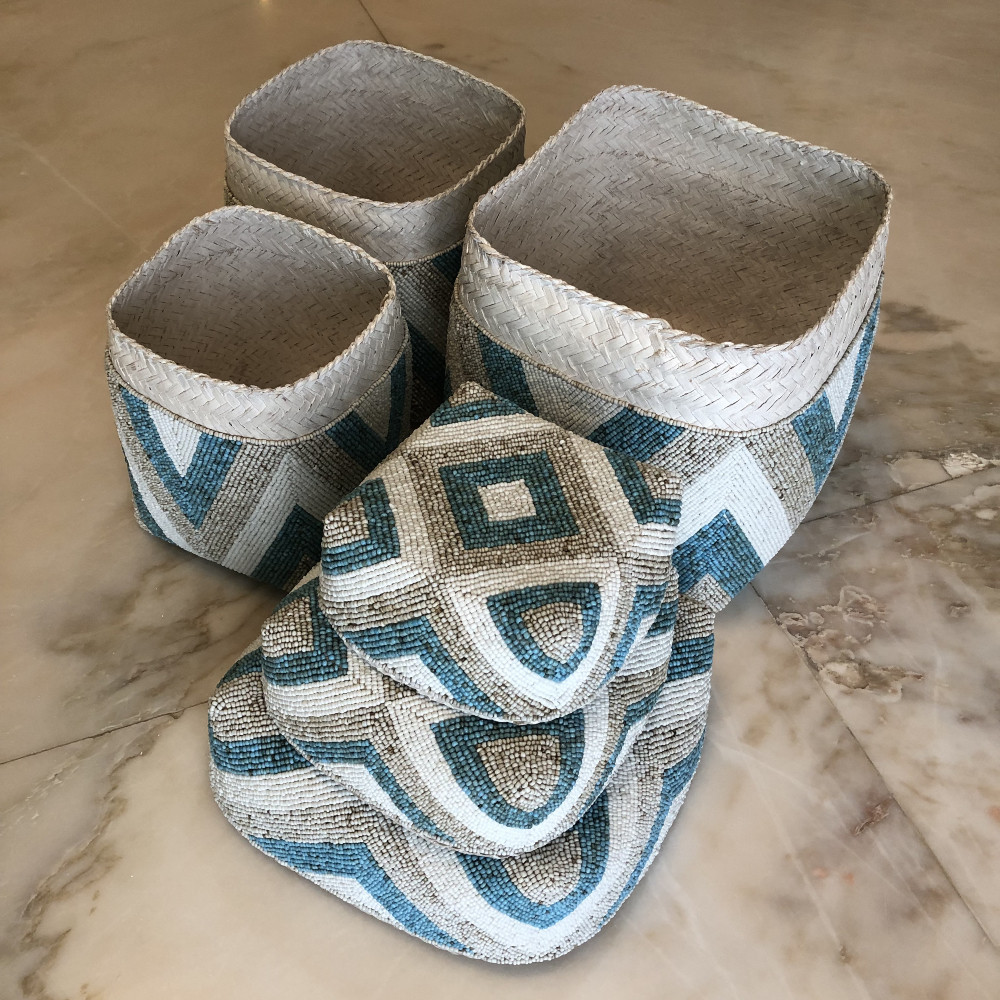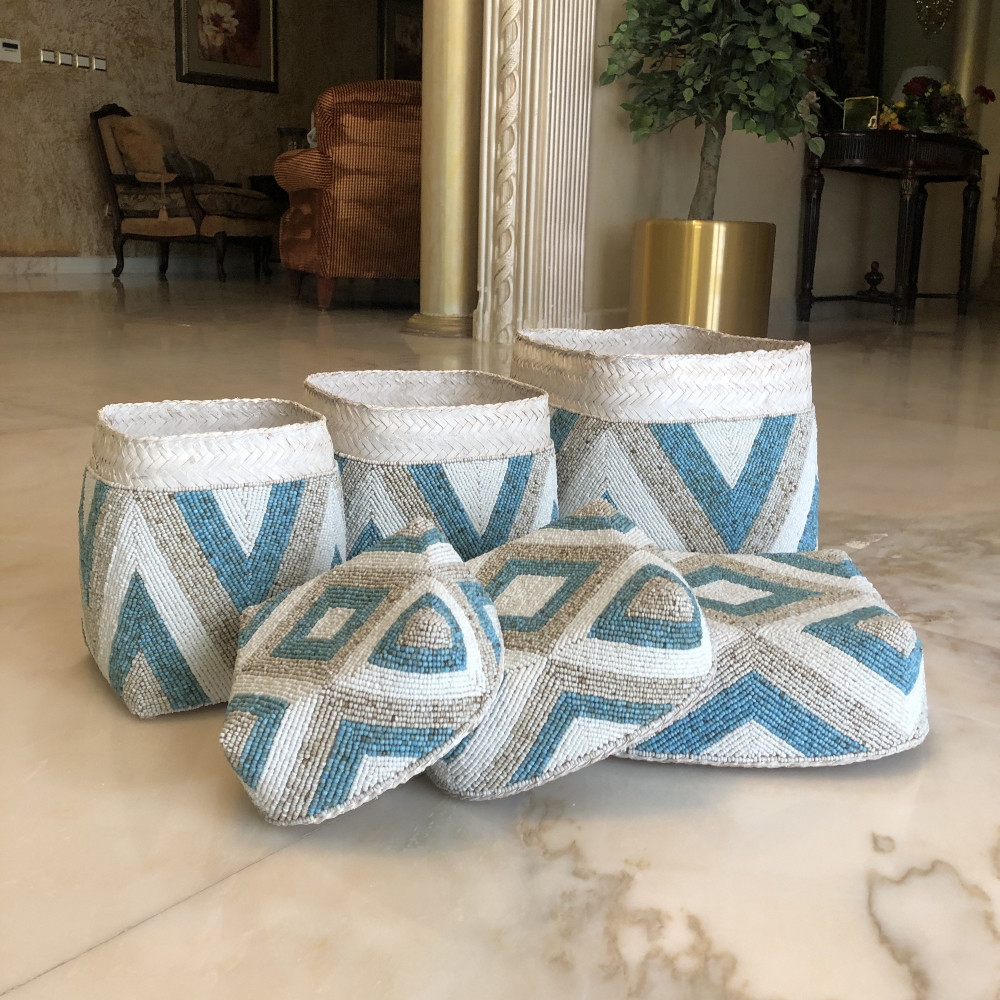 3صناديق من الخوص مزينة بالخرز (30سم، 25سم، 20سم)