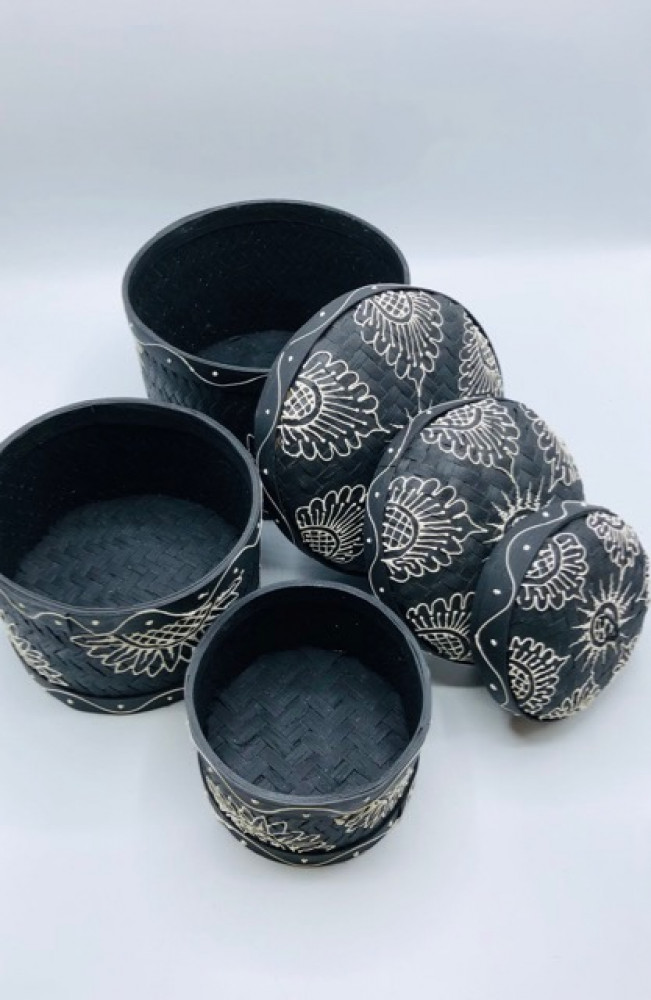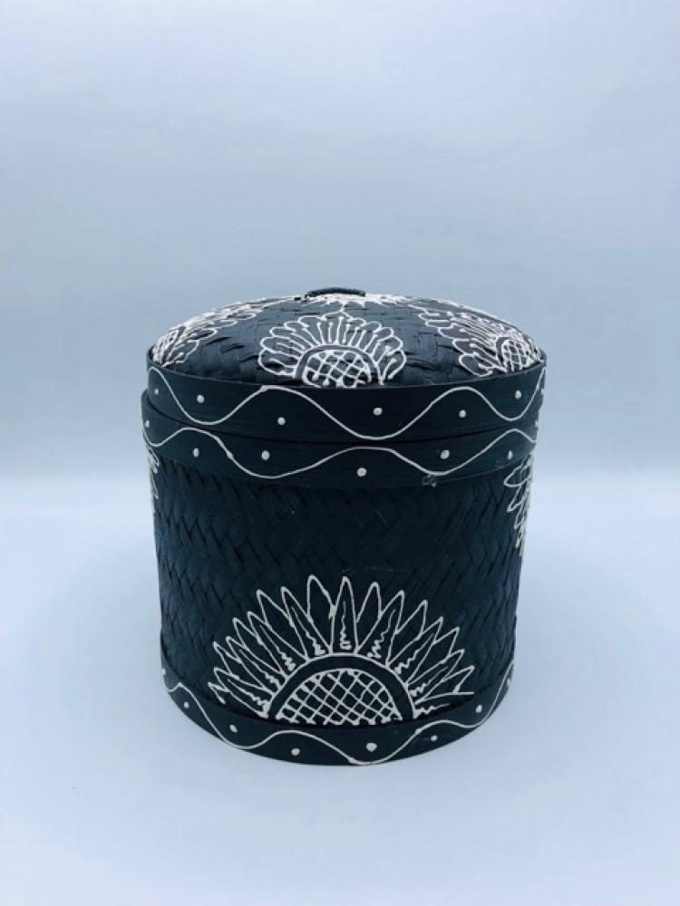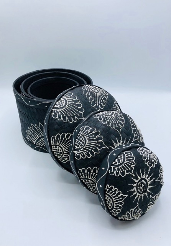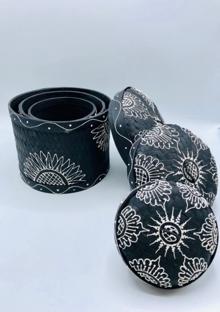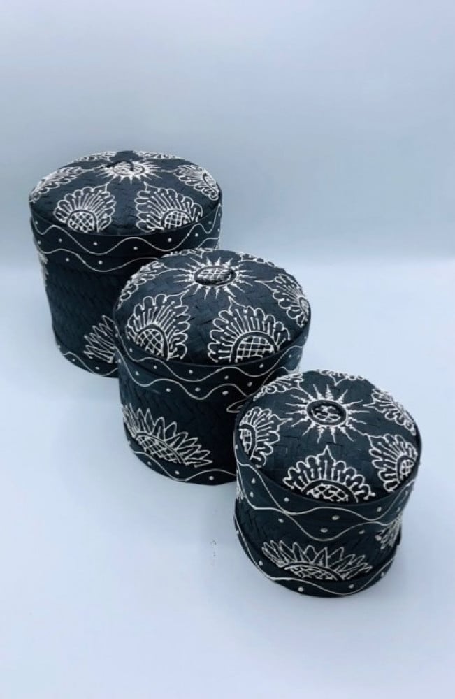 3 علب مع بعضها إسطوانية الشكل من الخوص لون أسود مرسوم بالأبيض ( 18سم، 15سم، 11سم)