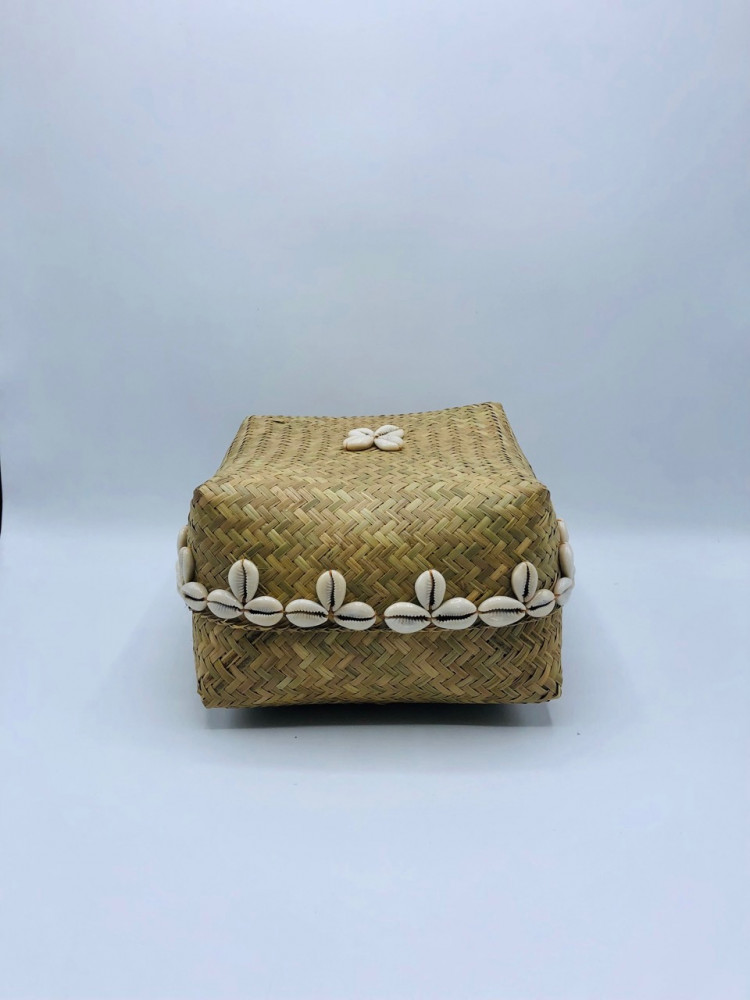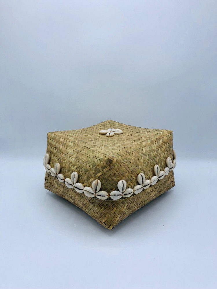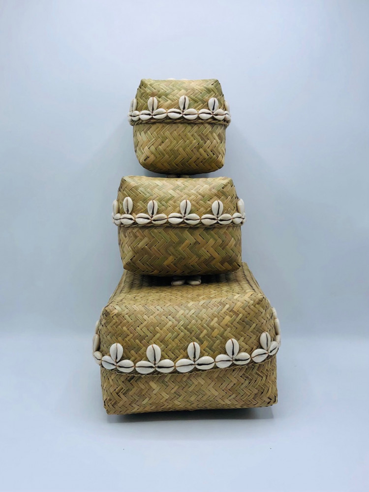 طقم مكون من 3 صناديق صغيره من الخوص مزينة بالقواقع من الأطراف (16سم، 13سم، 10سم)