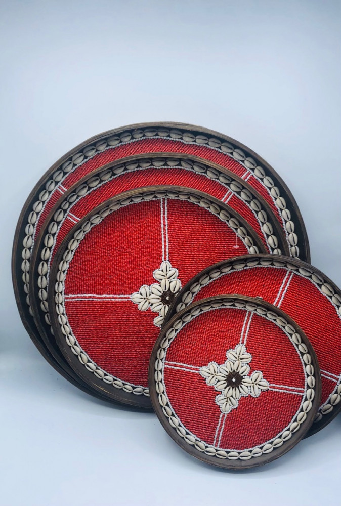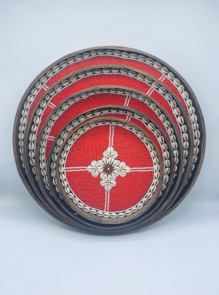 طقم مكون من 5 ألواح من الخوص الطبيعي مزين بالخرز (45سم،40سم،35سم،30سم،25سم)